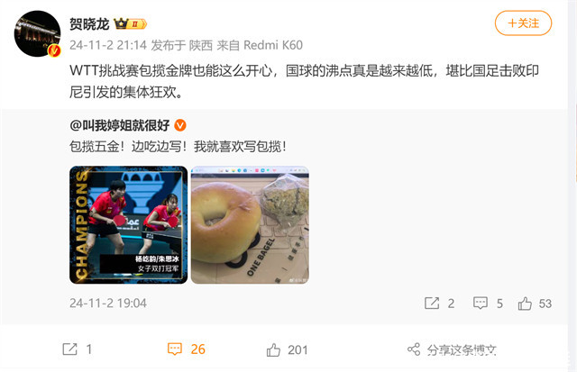 某乒乓球媒体人赛后开心庆祝:“包揽五金!边吃边写!我就喜欢写包揽!”不过,近来屡屡批评国乒的知名媒体人贺晓龙却泼了盆凉水:“WTT挑战赛包揽金牌也能这么开心,国球的沸点真是越来越低,堪比国足击败印尼引发的集体狂欢。”对于贺晓龙的实话,很多球迷也纷纷赞同,“捡点乐子,后边儿有的哭”“掩耳盗铃的故事又被龙哥揭穿了,龙哥总是一针见血”“主要外协都没参加,除了大藤沙月”“好久没吃肉了,见到肉丁了!”